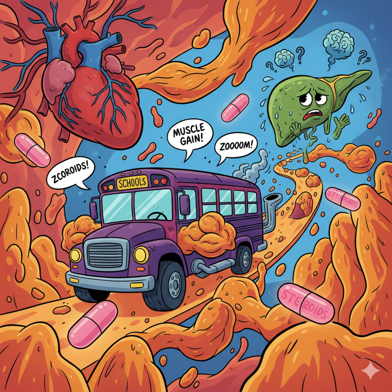 Our journey inside the body reaches its conclusion. The bus passes through the customs of the liver and crosses the lipid crossroads. Warning lights flash on the monitor. Particularly with oral steroids, there are signals that they can burden the liver, worsen cholesterol levels (HDL↓, LDL↑), or increase blood pressure. All these risks are not zero, even from 'just once' exposure.
